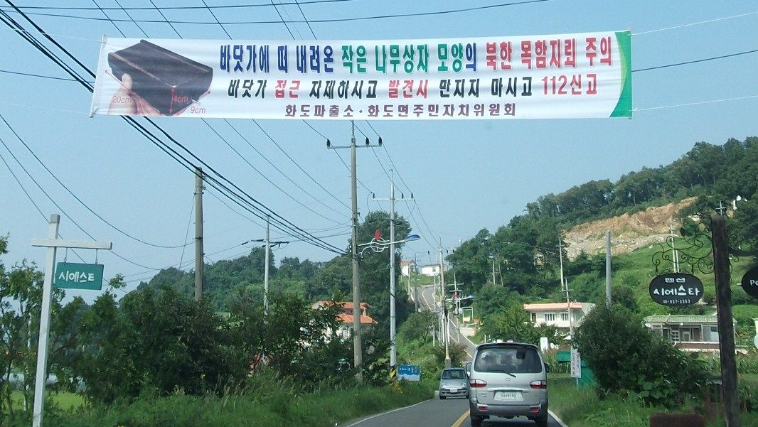 「北朝鮮が流す木箱地雷に注意しましょう」という横断幕が